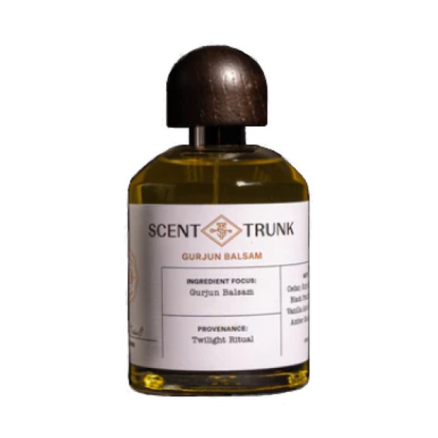 Scent Trunk Gurjun Balsam Eau de Parfum is an earthy, woody and balsamic fragrance that distils the mysterious aromas of a forest twilight into an enthralling niche perfume. Here unsurprisingly the sweet and camphor tones of gurjun balsam take centre stage. Native to parts of Asia, the gurjan tree produces a precious resin with a dry, pinelike aroma that has long been harvested for its ability to centre and energize. The ability of gurjan balsam to be both a dynamic force and a calming spirit makes it a significant scent for the charged atmosphere of ancient twilight rituals.