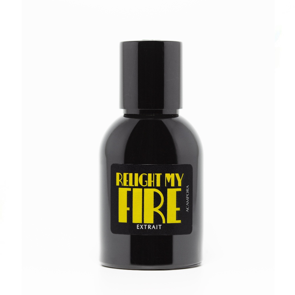 Acampora Relight My Fire Extrait de Parfum egy ultra erotikus virágos és fás pézsma illat. Kontrasztba állít keserű, friss és mély tónusokat, és mindeközben aldehides szerkezetével a klasszikus parfümkészítésre is rákacsint. A parfüm gazdag és lekerekített nyitása valahol a múlt emléke, amely szemérmetlenül besétál a táncparkettre. Az első illatjegyek lebilincselően intenzívek és sötétek – pezsgőbuborékként törnek fel a galbanum zöld, élénkítő jegyei, illetve a bergamott, a koriander és a boróka frissessége között. A parfüm szívében egy egészen lassú és csábító csavarral az illat férfiasból nőiessé válik, klasszikus virágok buja csokrai komplexen összefonódnak a fenyőbalzsammal. A parfüm alapja állatias és meleg: bőr, vanília és pézsma egy domináns peru balzsam jegyet fűt.