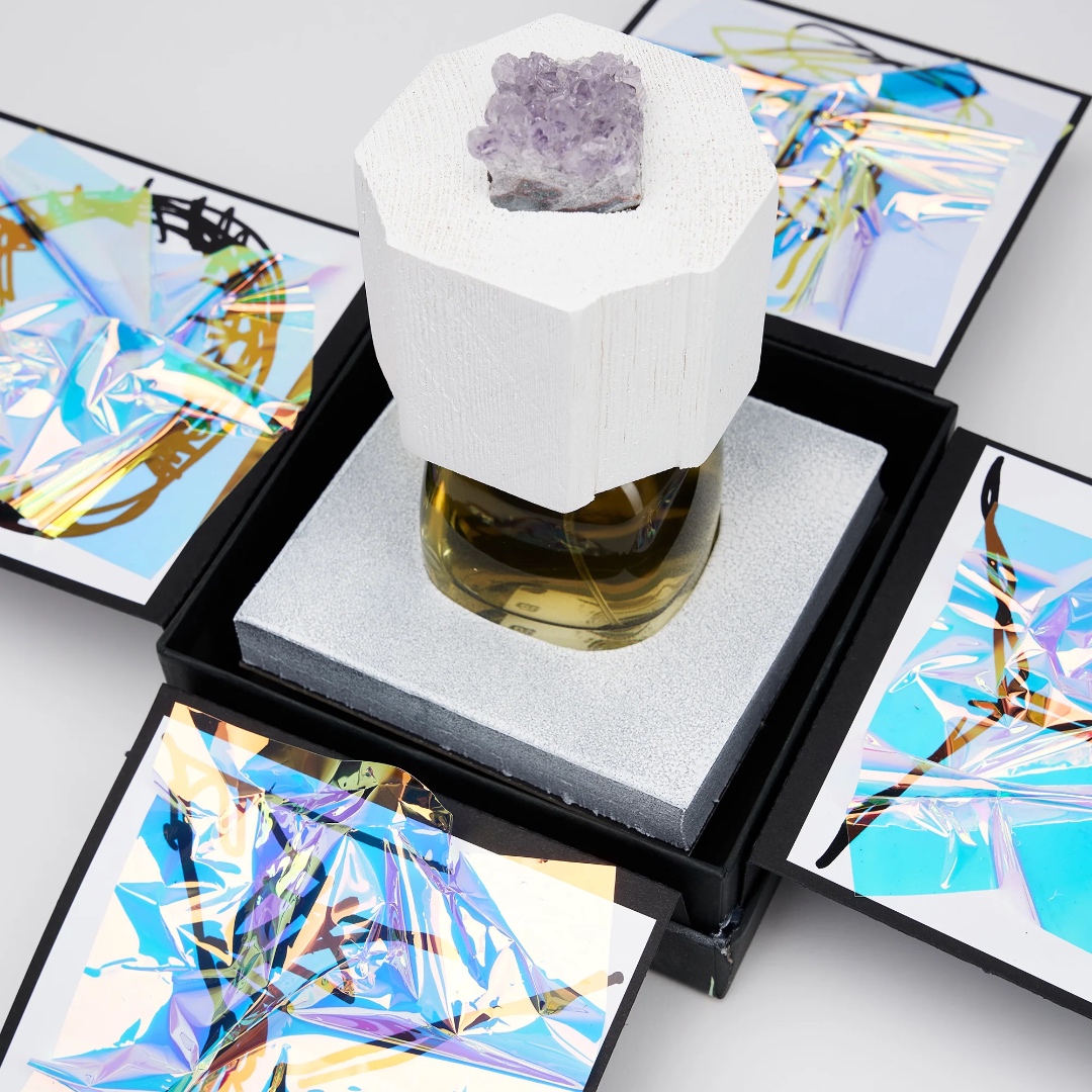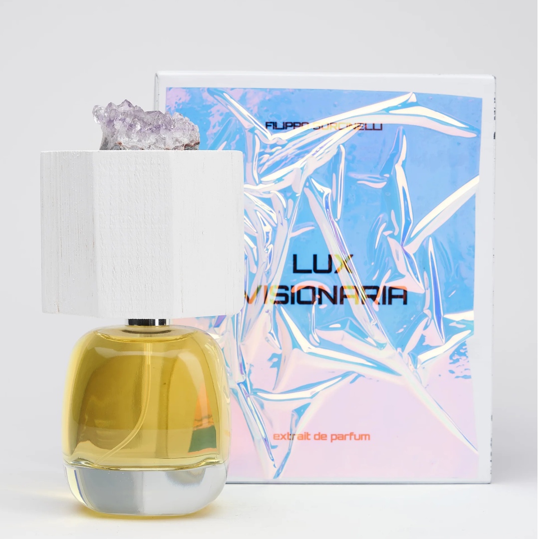 Filippo Sorcinelli Lux Visionaria a fényt parfümös üvegbe varázsolja, és kettős hatást fejt ki: egyrészt a külvilágot fényesíti fel és színezi át az ametiszt lilás színárnyalataival, a belső lelki világot pedig beborítja az ametiszt visszatükröződésének fényáradata egy megnyugtató belső békéért.