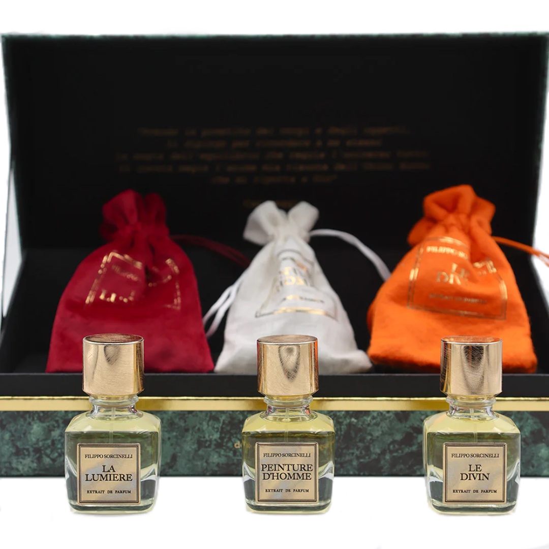 Filippo Sorcinelli Unico Suono nem egy lineáris utazás, hanem a fény, az emberi test és a szentség közötti párbeszéd. Minden illat önállóan is létezhet, de együtt a kinyilatkoztatás, zűrzavar és kegyelem ciklusát alkotják. Három parfüm mint viselhető meditáció, mint intim találkozás a művészettel.