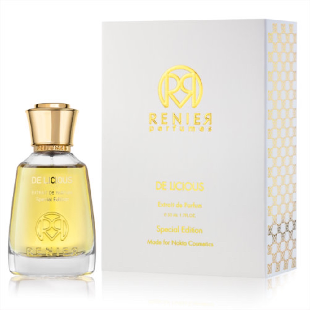 Renier Perfumes De Licious (Extrait de Parfum) egy édesen fás csokoládés ínyencség, amely a Nagy Bazárban található luxus finomságokat ünnepli. Pazar narancsos csokoládé borítja a parfüm nyitásában a yuzu és az ánizs orientálisan megcsavart feszültségét – az összetevők egymás mellé helyezése megragadja a bőség és a túlzás érzetét. Az értékes aromák kidolgozott sorát mézes édességek és szárított gyümölcsök jegyei tűzdelik, mély, lágy édességet és gazdag textúrát adva.